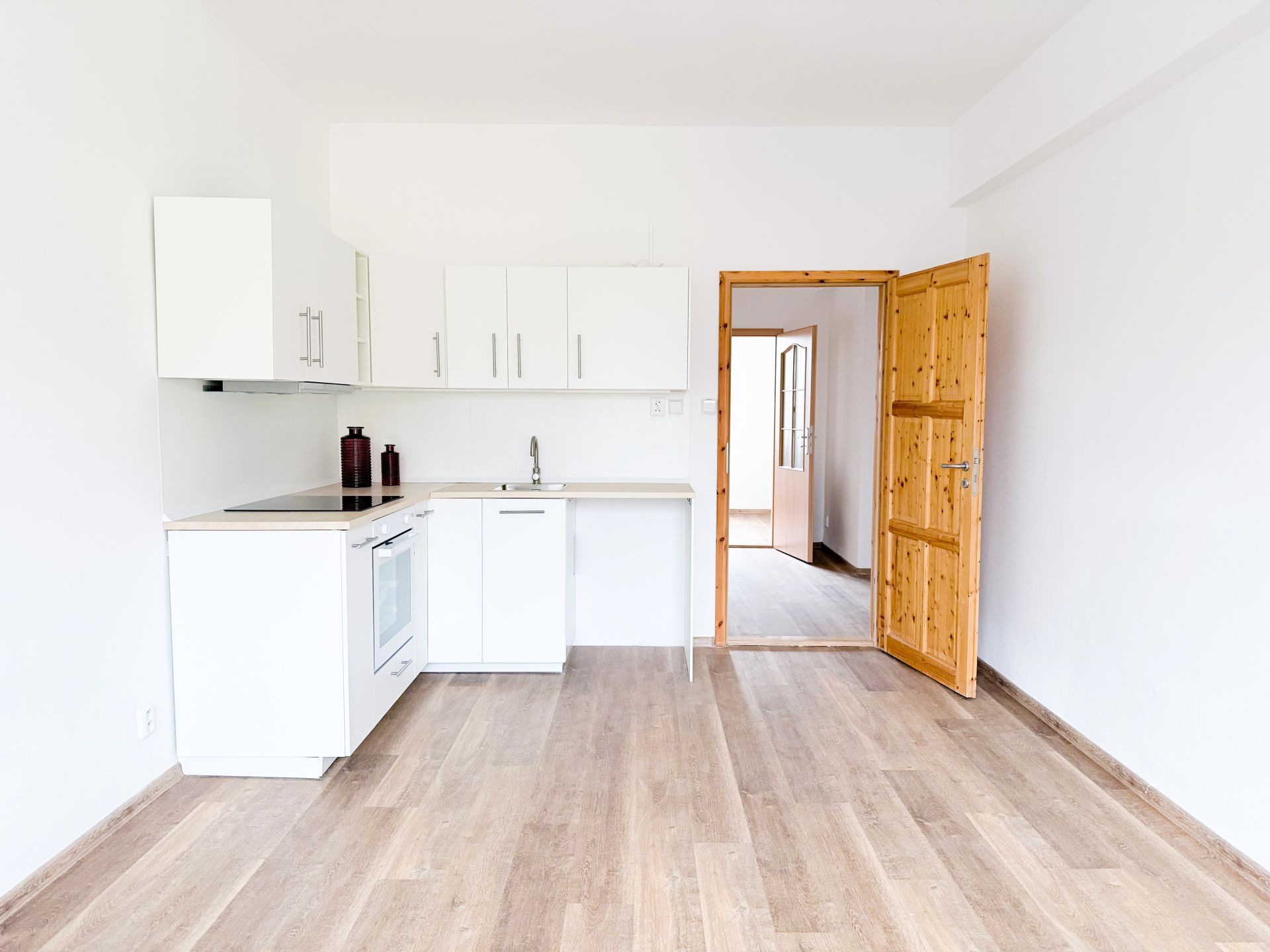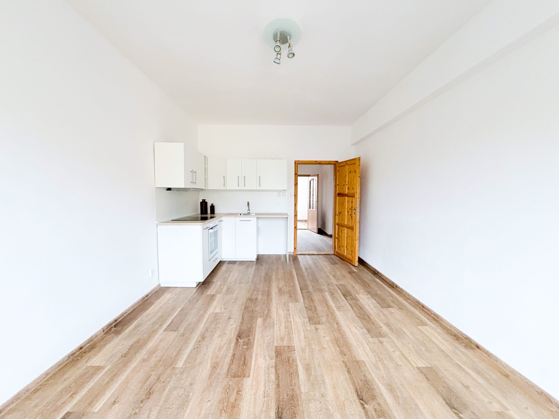 V obývacím pokoji, jehož součástí je kuchyňský kout, jsou instalovány venkovní žaluzie na dálkové ovládání, které zvyšují komfort bydlení. Praktické uspořádání bytu umožňuje maximální využití dostupného prostoru a dostatek místa pro nové uživatele.