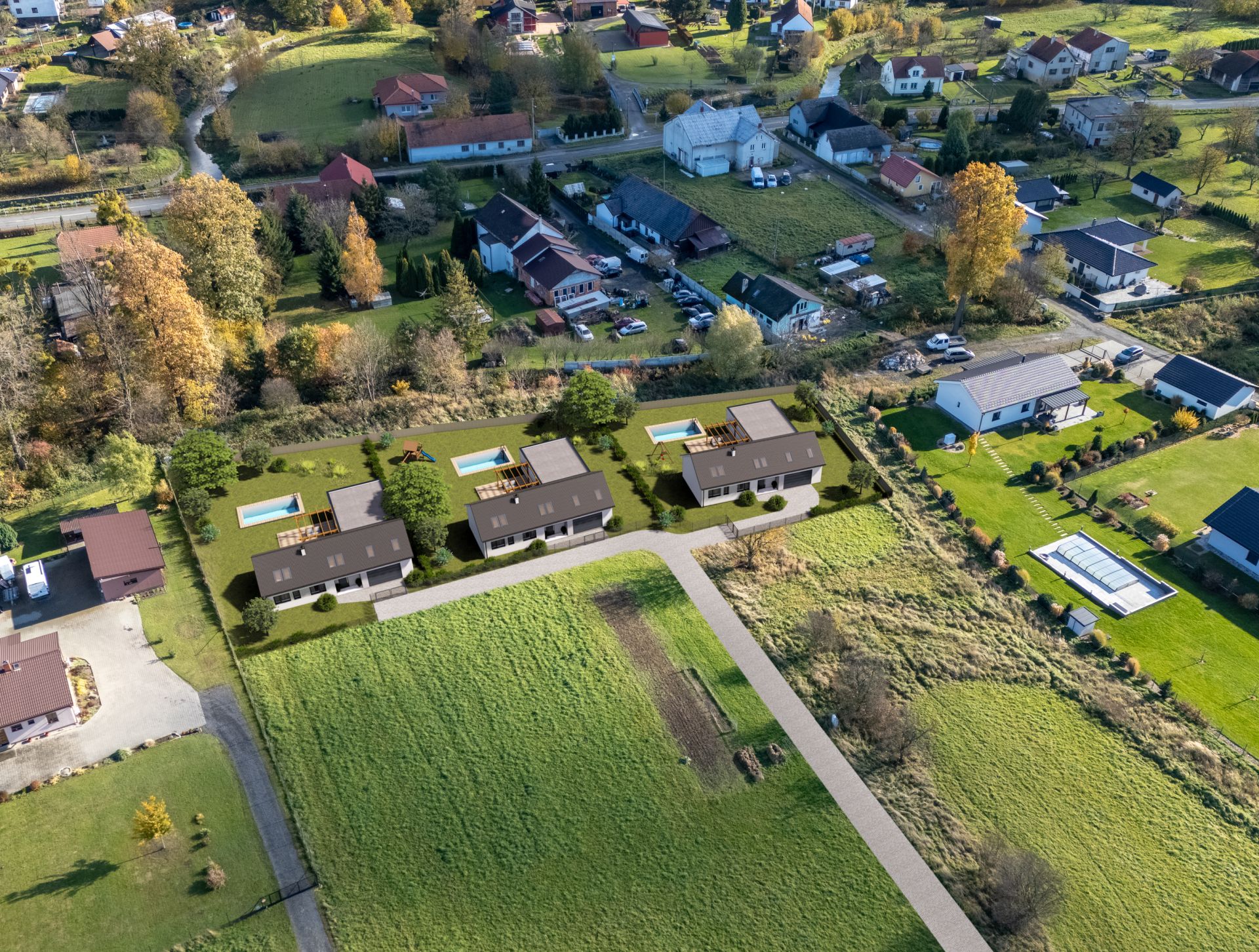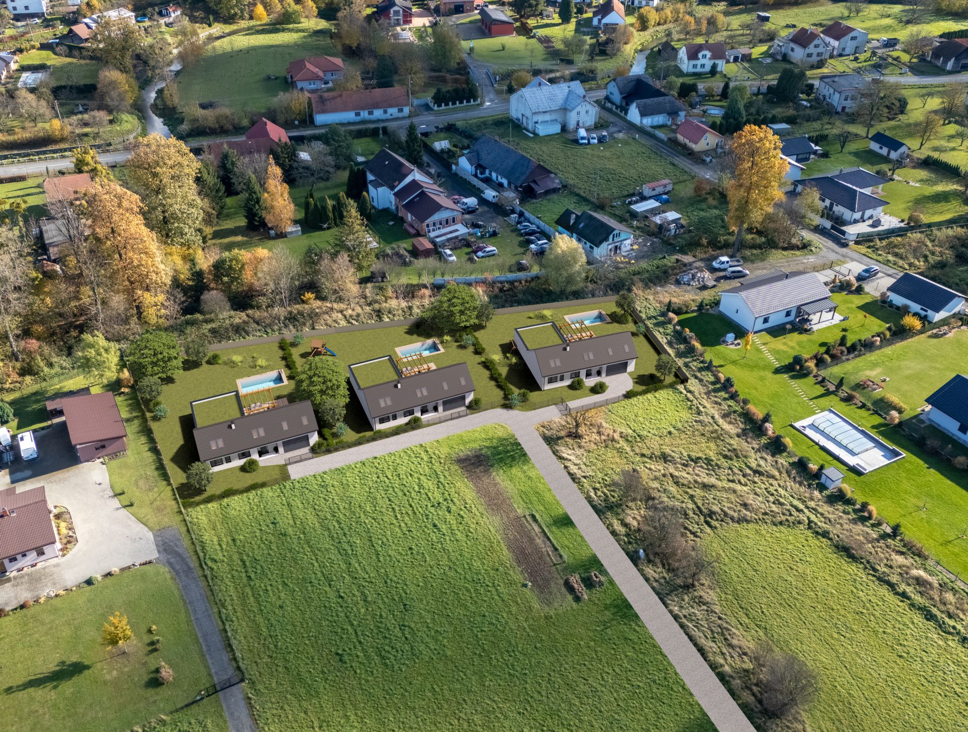 Pozemky jsou rovinaté, ideální pro výstavbu rodinných domů. Inženýrské sítě (voda a elektřina) jsou již přivedeny k hranici pozemků, což výrazně zjednodušuje a urychluje zahájení výstavby.