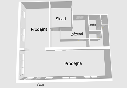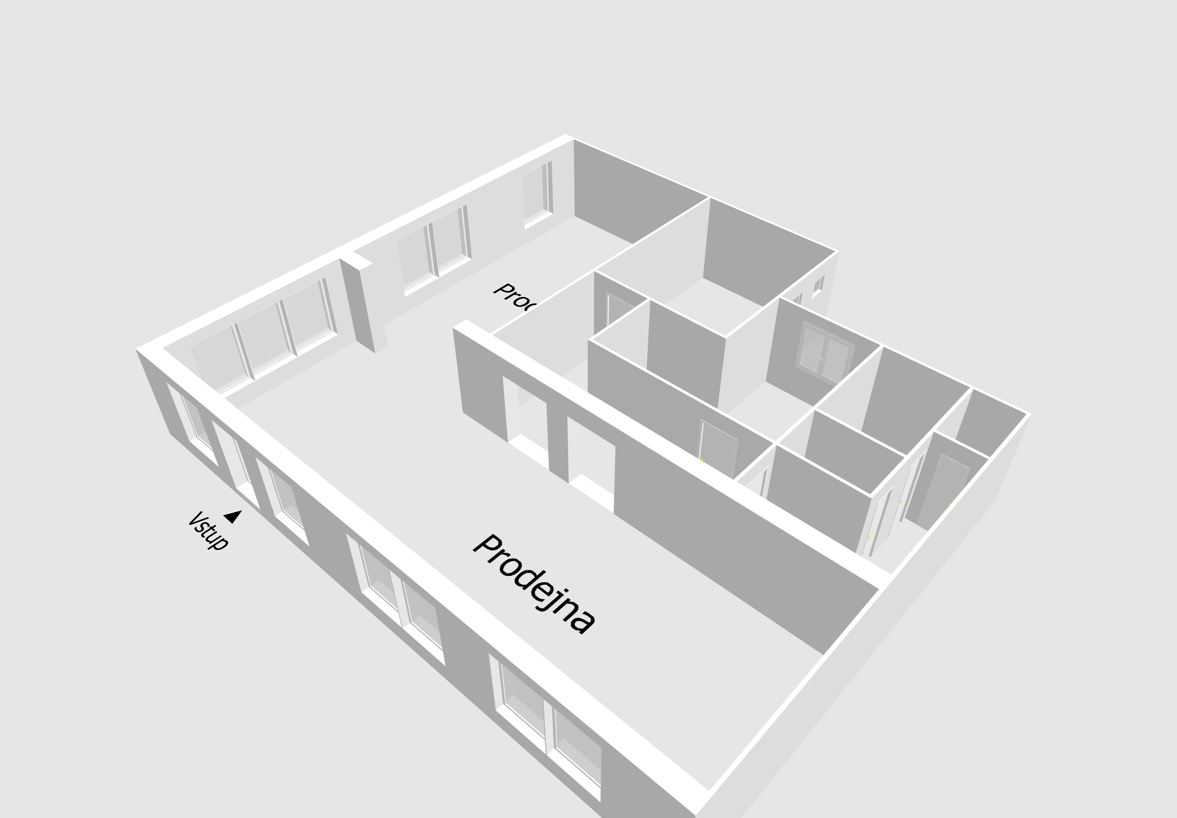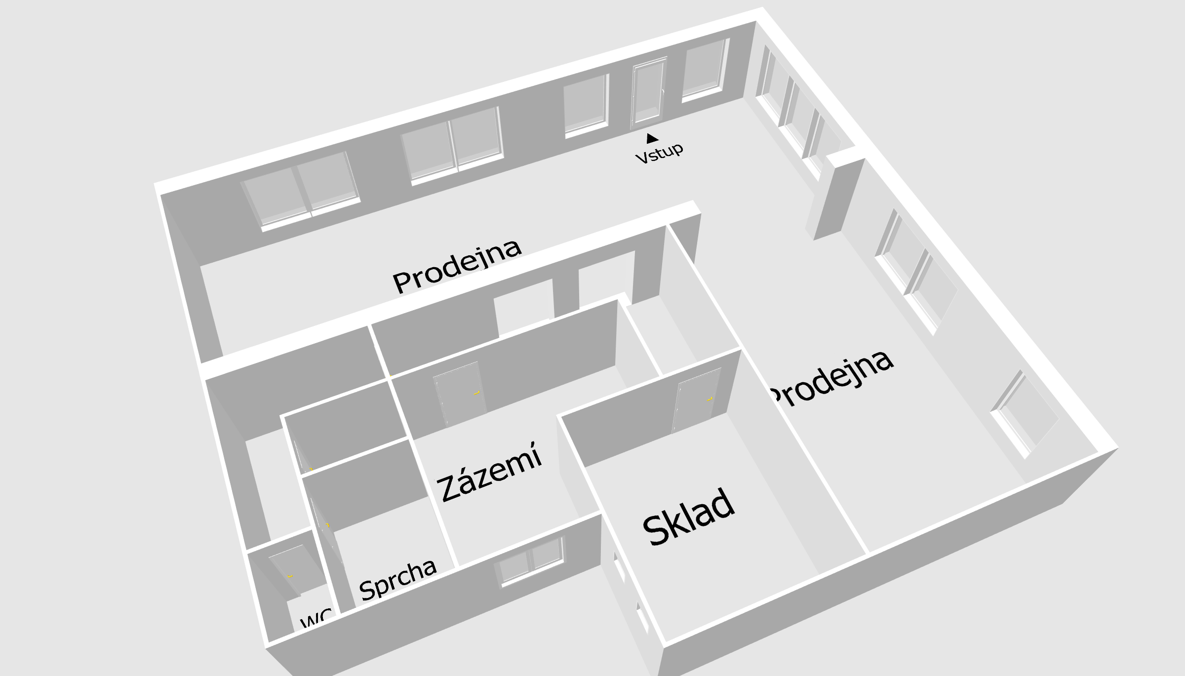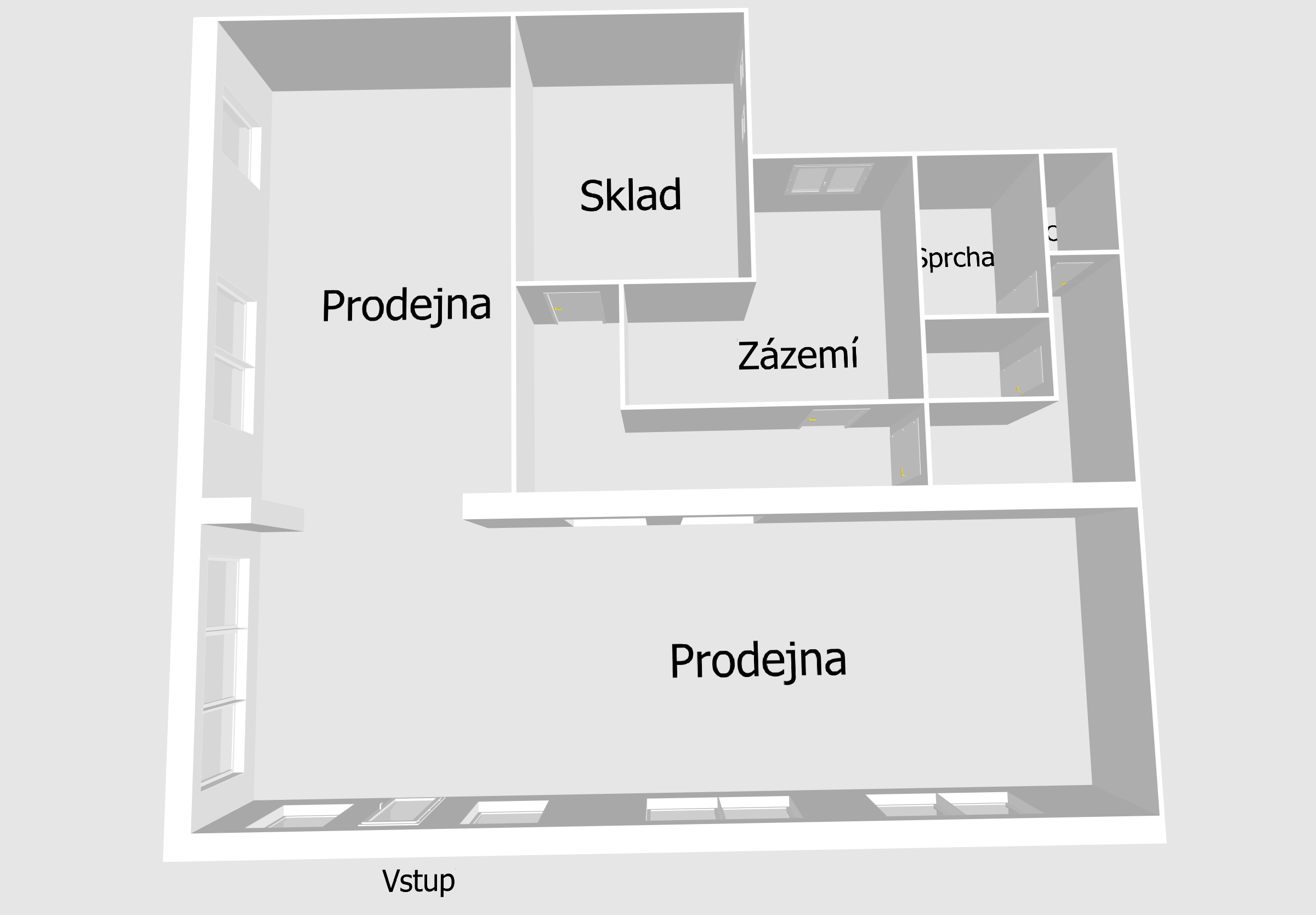 Prostor disponuje hlavní prodejní plochou o velikosti přibližně 150 m², která poskytuje flexibilní uspořádání dle potřeb nájemce. Významnou předností jsou velkoformátové prosklené plochy orientované do ulice, umožňující vytvoření atraktivních výloh a zajišťující výbornou viditelnost i přirozené prosvětlení interiéru.